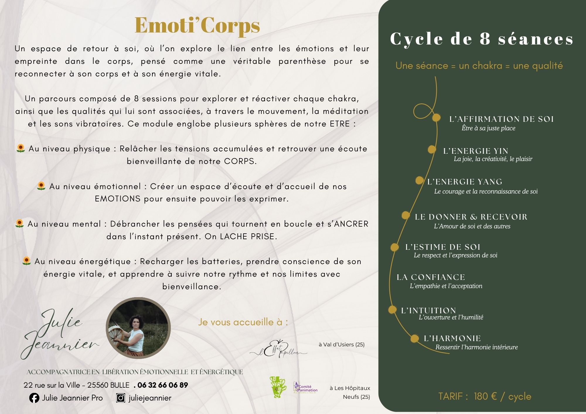 Un espace bienveillant pour s’autoriser à souffler, à se recentrer et à explorer le lien entre les émotions et leur empreinte dans le corps. Un temps de pause et de cocooning pour renouer avec votre énergie vitale à travers l’exploration de vos chakras.
